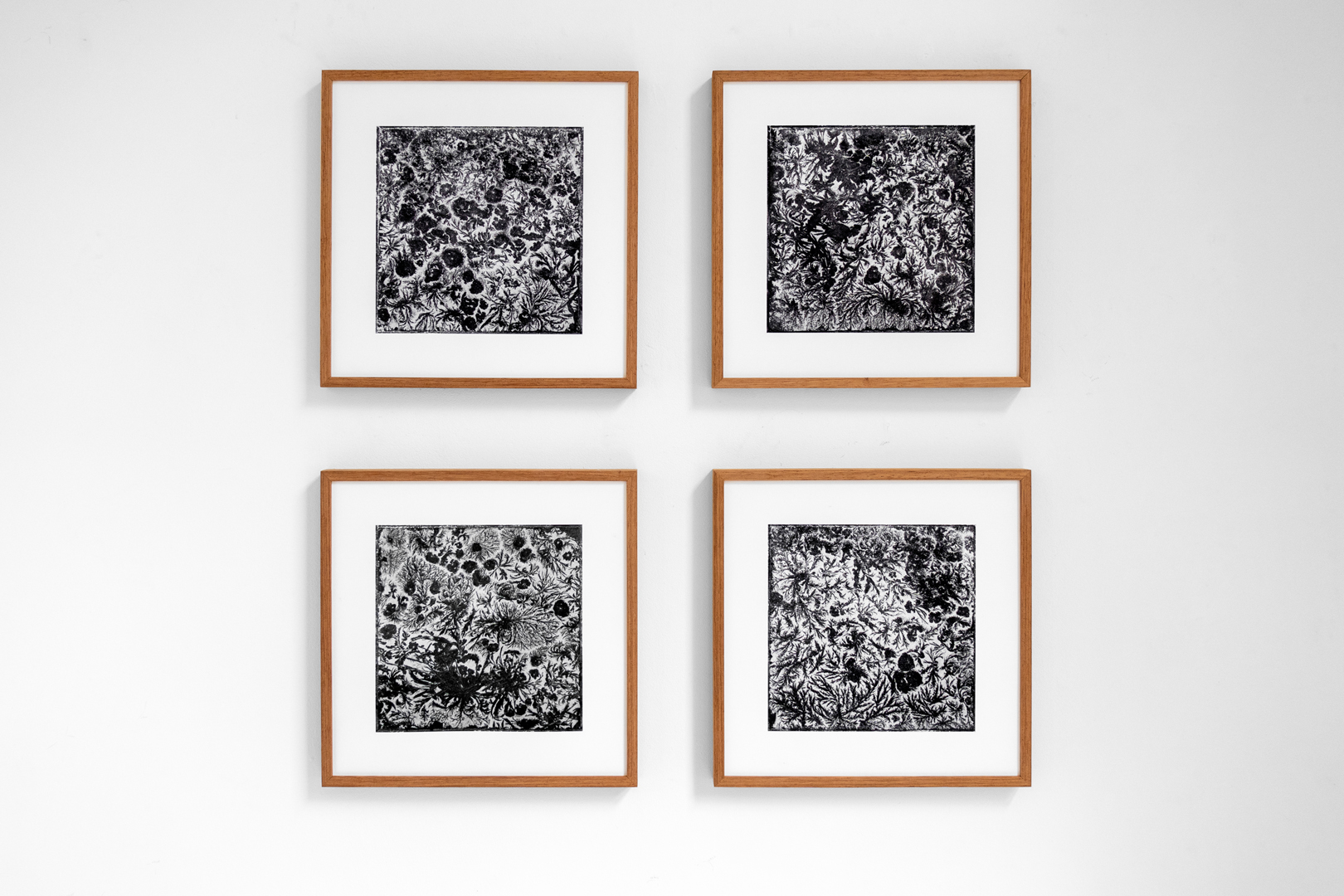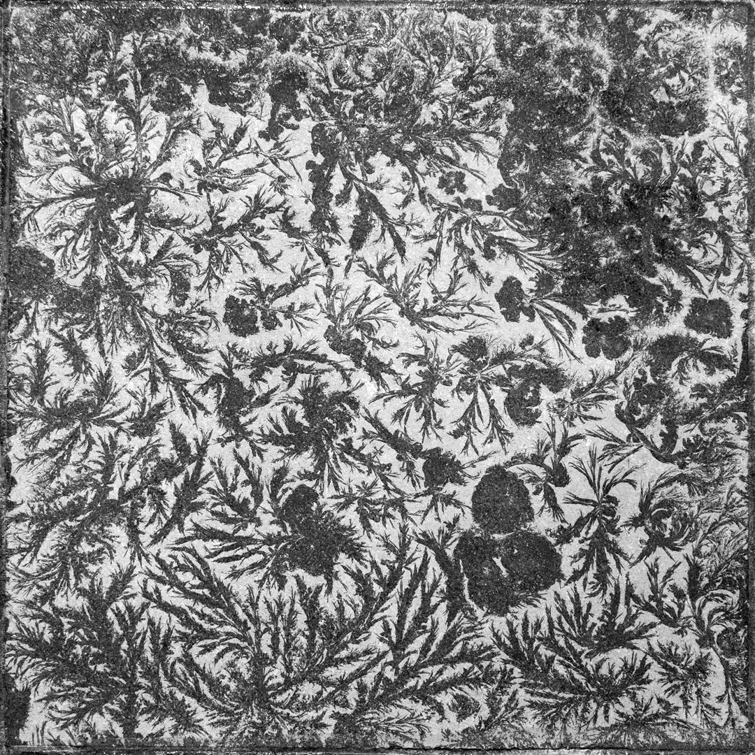 Jacky détaille, discret, cadre en taille douce, le noyer sous la neige, l’épiderme givrés du potager. Microsillons transis. Bleu, l’éventration de carrières. Après les catarrhes de verglas le printemps se pointe enfin. Jacky grave quotidien, la vie par le ténu. Françoise bouquine. Le vent passe le chas des haies, ébouriffe la gueule du chat, les orges, caresse les mômes. La brise trousse les poules, ébranle l’armoire à tomates, pousse les nuages qui déjà en ébullition se débordent comme lait bouilli. Voie lactée, preuve du ciel. Condensation. Prairies de paresse au dessus de l’air.