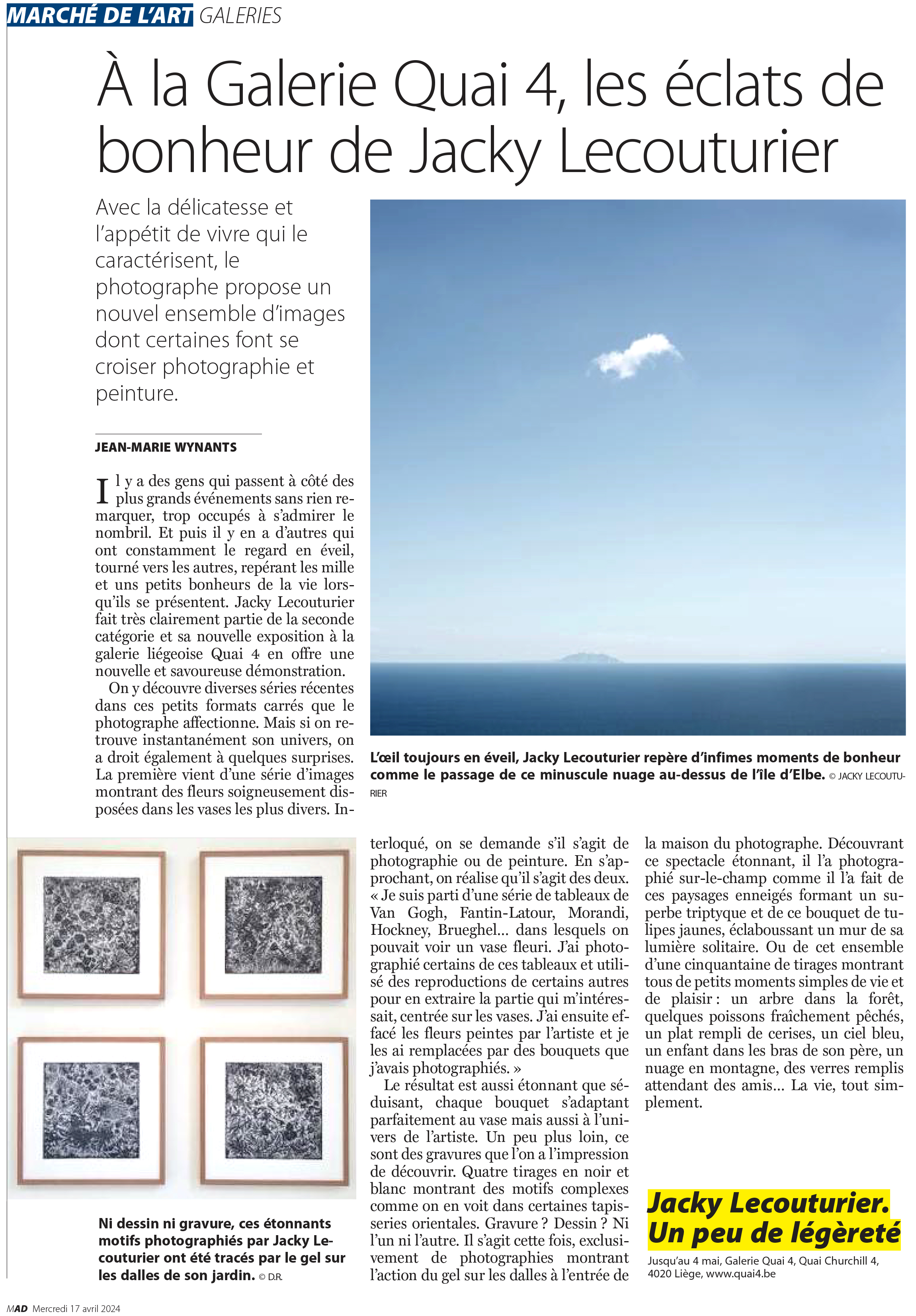 « Nous ne quitterons pas cette île de rêve. Sans jeter un dernier regard » chantait Bashung ; l’île de rêve de Jacky Lecouturier, se trouve tant dans le Condroz qu’en Corse ou encore en Islande... Chaque lieu devient pour lui un havre sur lequel porter son regard et qu’il prend le temps de photographier.